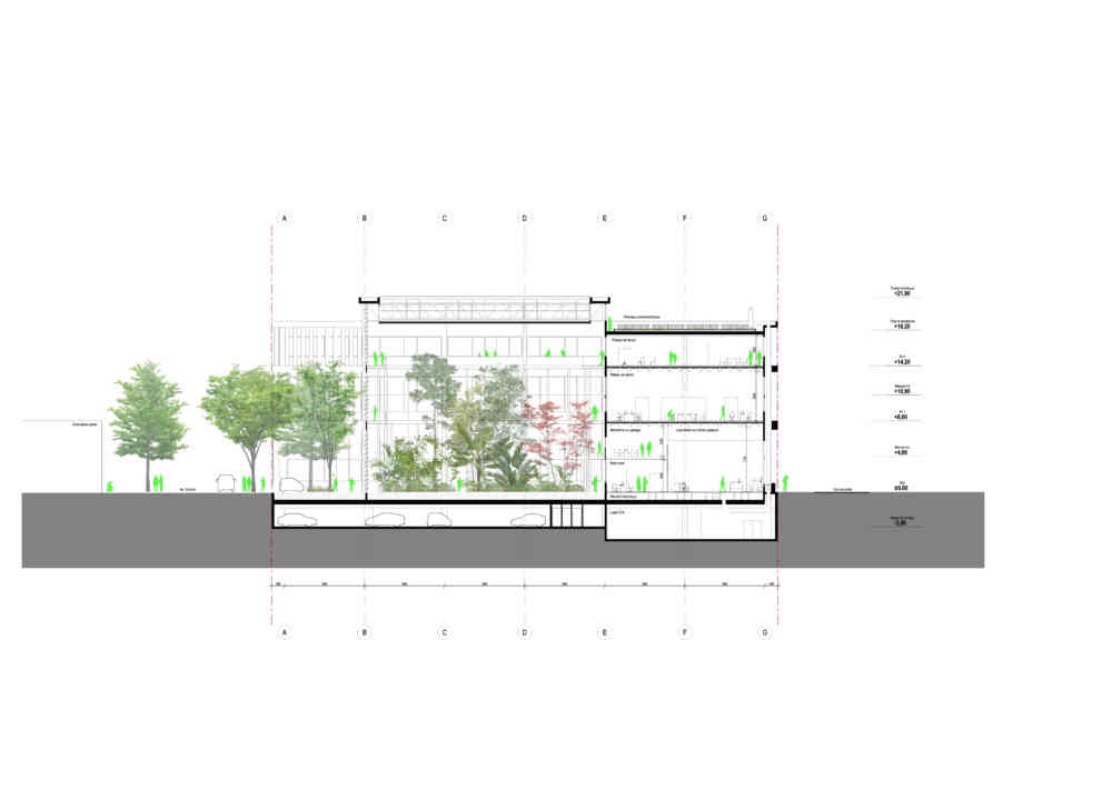 L’observation est la thématique d’un « jardin en creux » au nord du bâtiment, d’inspiration naturaliste et réservoir de biodiversité. L’usage se concrétise par les terrasses suspendues du bâtiment mais aussi par la spectaculaire serre bioclimatique, l’expérience par l’équipement de phyto-épuration en pied de bâtiment et en toiture où la végétalisation se combine avec la toiture photovoltaïque.