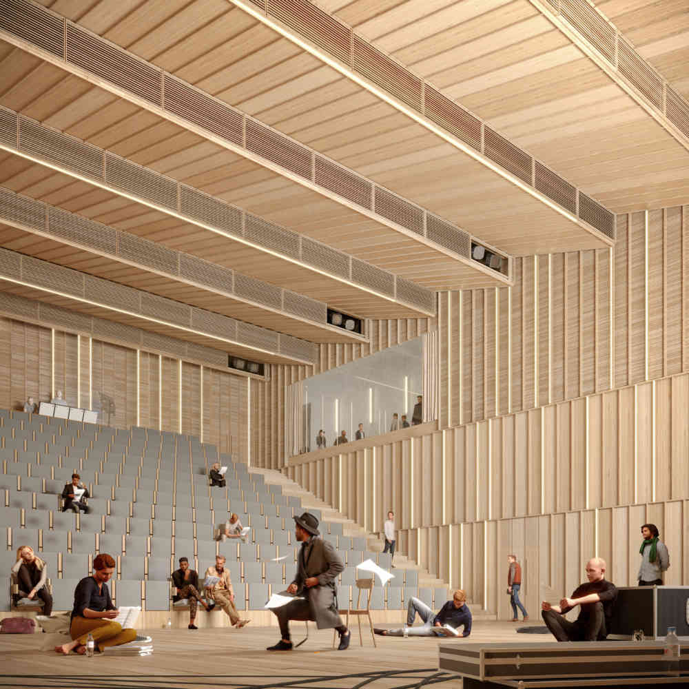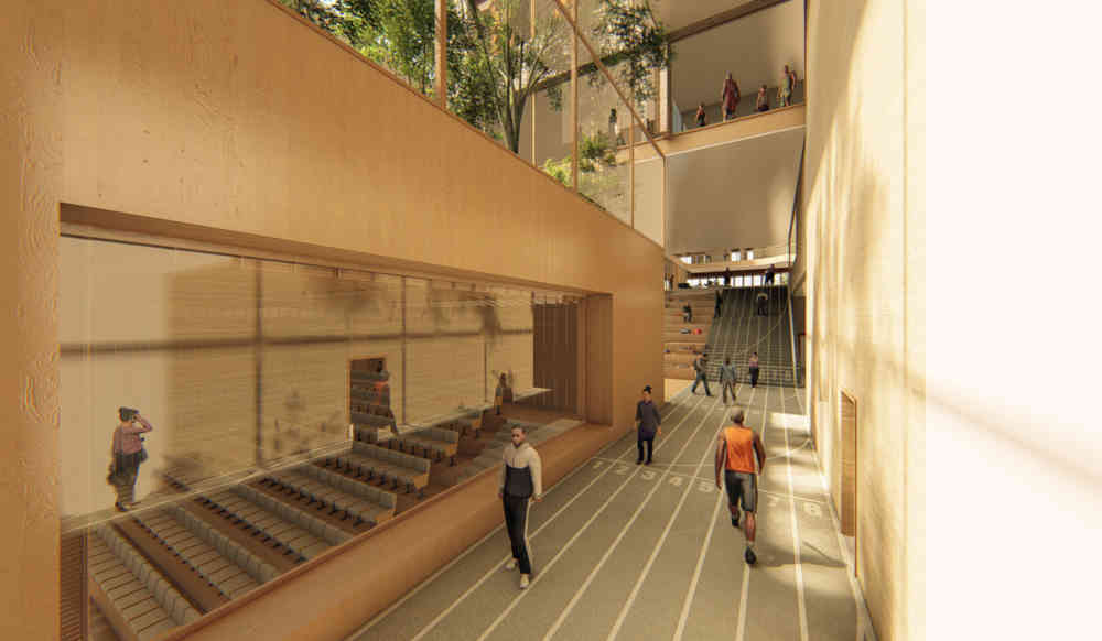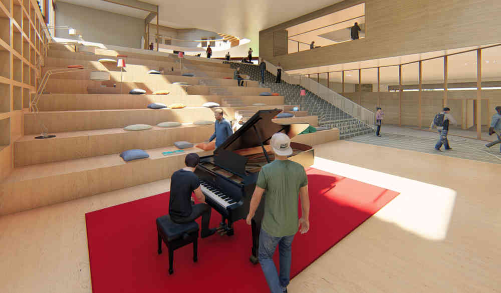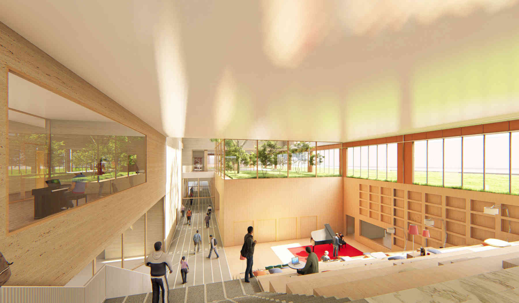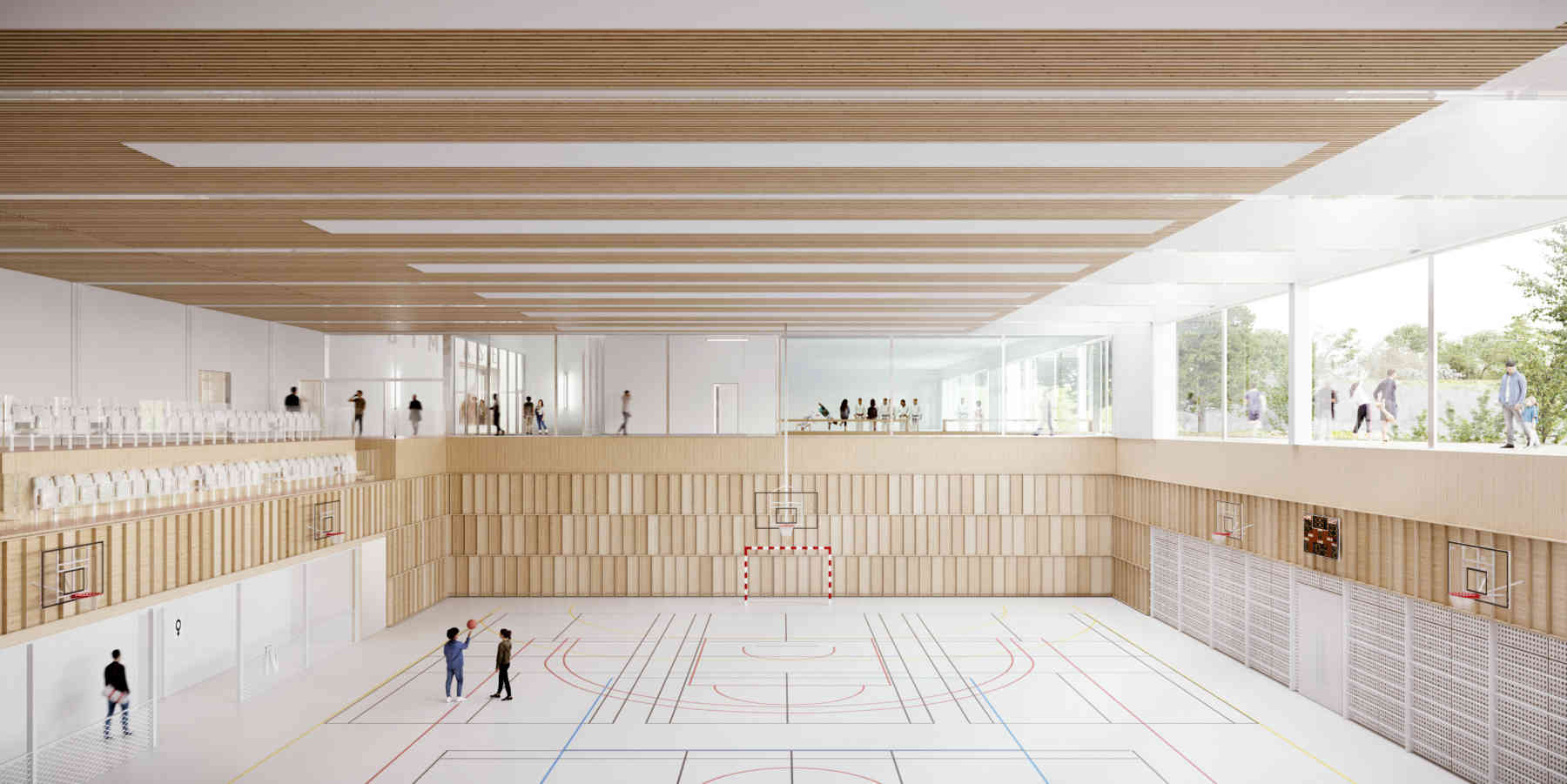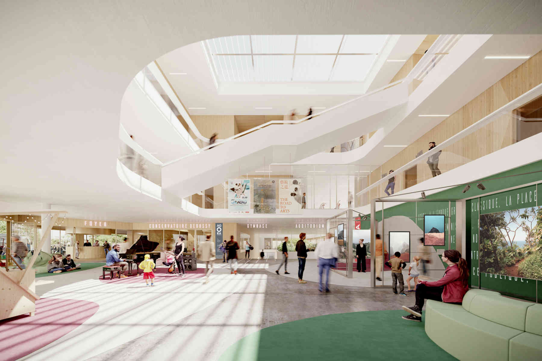 • l’articulation d’équipements distincts à première vue, avec chacun leur identité programmatique propre, c’est-à-dire de l’articulation d’identités particulières : notamment, le Conservatoire et le Gymnase s’articulent sur un grand axe intérieur répondant aux objectifs d’urbanité intérieure fixés au programme, offrant une grande richesse de lieux appropriables au gré des besoins et de la vie de ces équipements, tout en assurant une parfaite fonctionnalité pour chacun d’entre eux ;