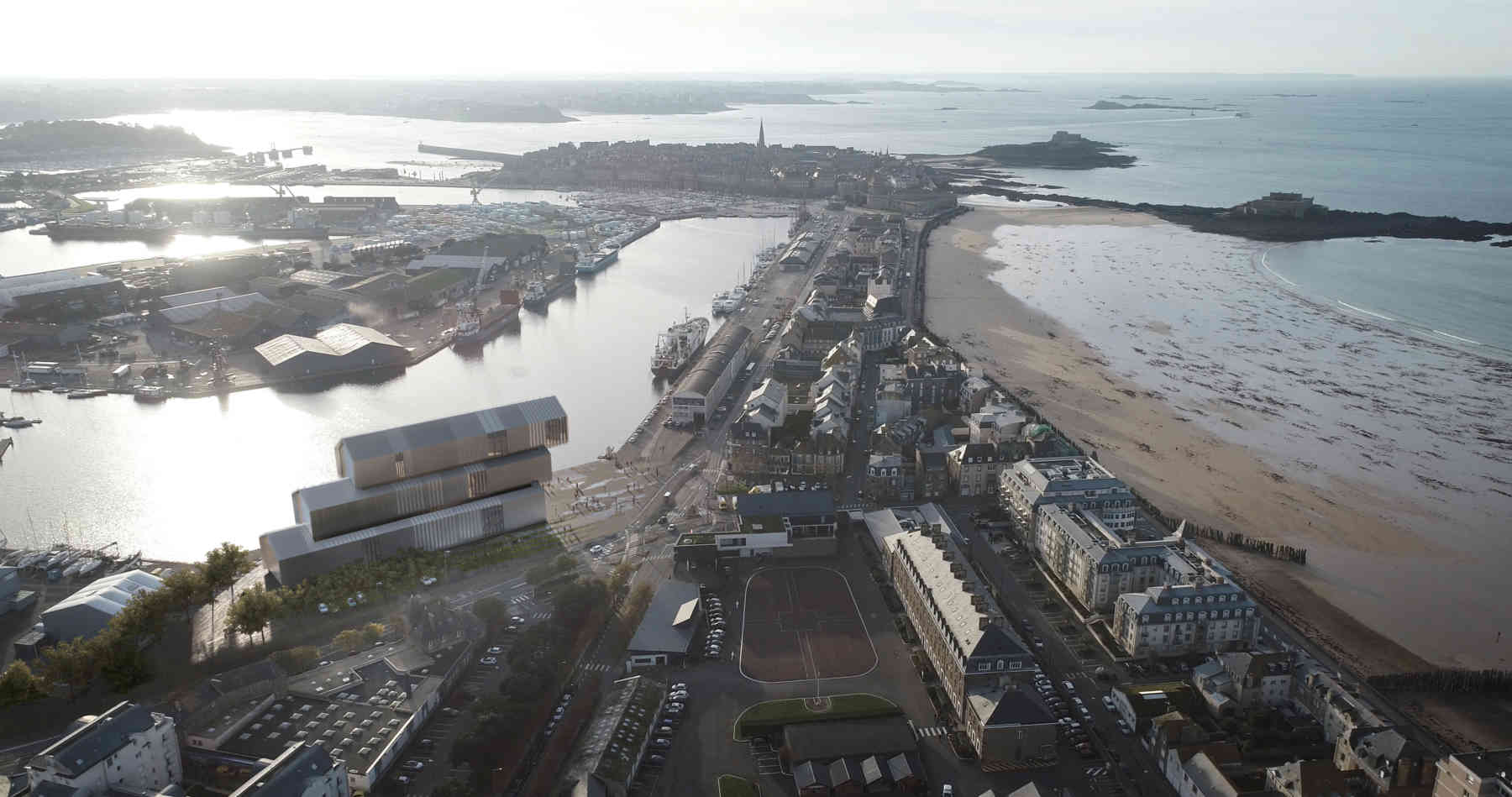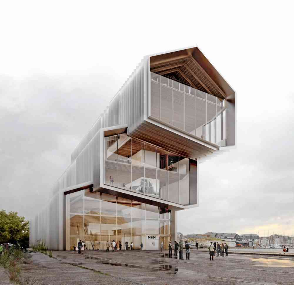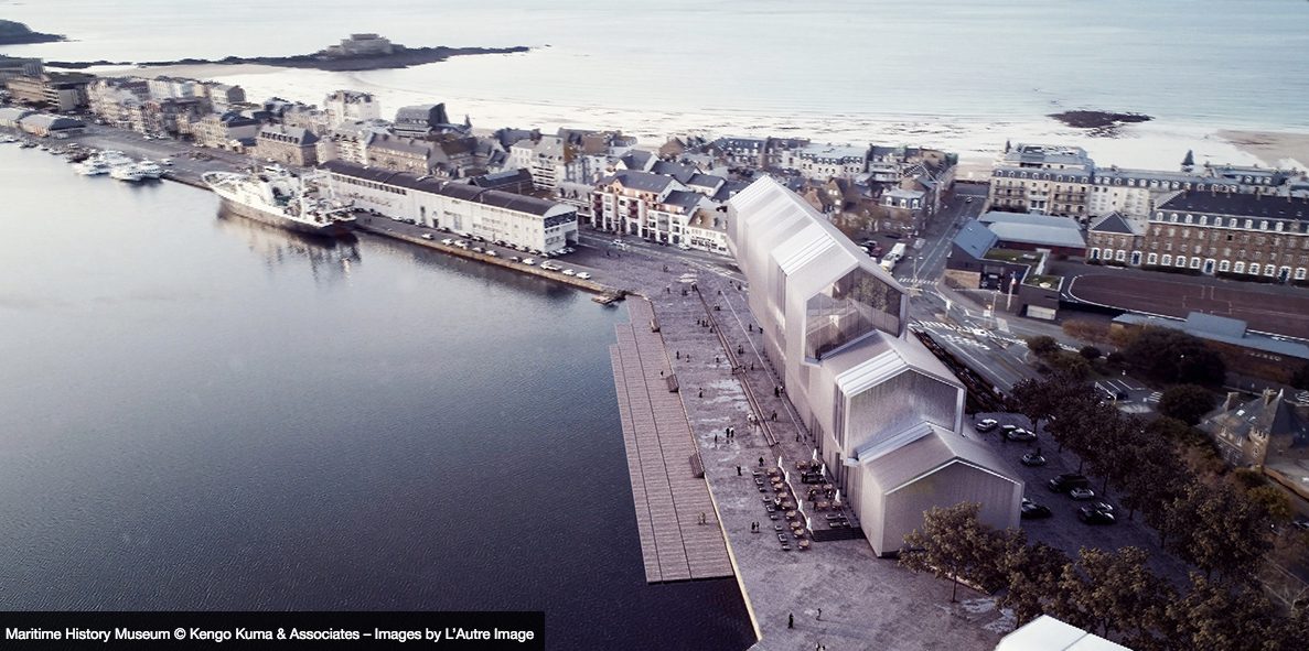 Le Musée d'Histoire Maritime de Saint Malo est en préparation depuis plus de 15 ans. Actuellement installé dans le Château de Saint Malo, forteresse du XVème siècle, était devenu progressivement obsolète et à l'opposé du discours d'exploration et de grands espaces qu'il était sensé évoquer. Le Projet scientifique et culturel de Philippe Petout assisté de Jean Philippe Roze, était fondé sur l'axe de l'Histoire Maritime dont Saint Malo est légitimement l'un des meilleurs témoins. Les 3 grandes sections de la visite déploient les thèmes "des Navires et des Hommes", du "Grand Commerce et ses Espaces Maritimes", et de "la Guerre sur Mer", couvrant l'antiquité à l'époque moderne. Une vision haute permettant l'interprétation de la construction de la cité Malouine, façonnée par l'activité maritime, est questionnée. AG Studio a été mandaté en 2008 pour préparer l'accomplissement du développement du musée dans toutes ses dimensions: de sa future localisation à sa muséographie. Le 22 février 2018, soit 10 ans plus tard, l'architecte Kengo Kuma et les muséographes Projectiles, remportent le concours avec un projet de grandes dimensions culminant en vigie à 35m sur le bassin Dugay Trouin. La grande forme volontaire et raffinée n'est pas sans rappeler celle des grands vaisseaux.