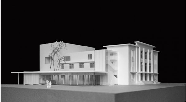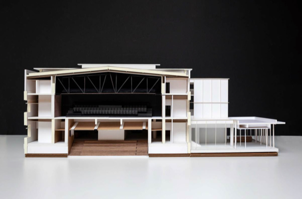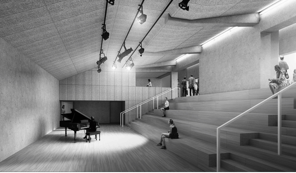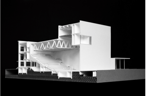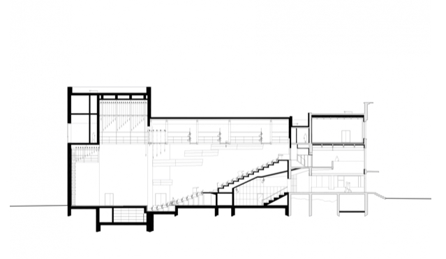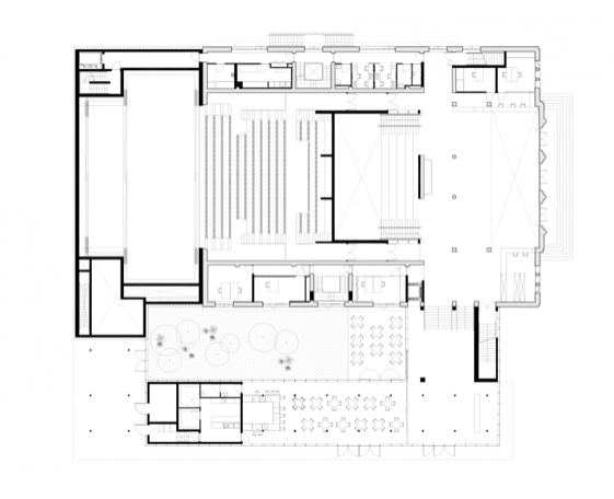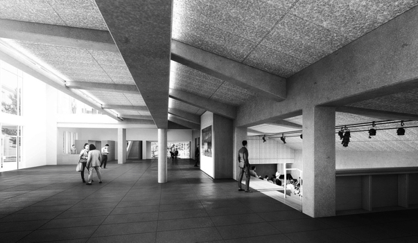 AG Studio a mené une réflexion approfondie avec la collectivité et la maîtrise d’usage pour redéfinir, à parti d’un existant contraignant, les standards d’un nouveau lieu de diffusion. Le programme arrêté comprend une grande salle partiellement modulable de 630 places/900 debout, une petite salle gradinée de 105 places située à l’aplomb de l’ancien hall et une nouvelle logistique théâtrale (scénique, administrative, artistique). Mais le travail programmatique le plus approfondi a été celui de la conception d’un nouvel accueil. Le point de départ a été la reprise de l’idée même d’accueil d'un théâtre de ville qui était à l'époque dans la grande lignée des "maisons du peuple", en lui conférant un rôle de tiers lieu, ouvert en permanence et support d’une vie artistique et culturelle parallèle à celle du grand lieu. Celui-ci prend la forme d’un café original en fond de place urbaine et en greffe contemporaine sur le bâtiment des années 30. Il se poursuit à l’intérieur par une reprise de l’espace sous gradin dont notre étude de faisabilité avait permis de prendre conscience de l’importance volumique une fois cet espace débarrassé des sanitaires et d’un immense dégagement inutile.