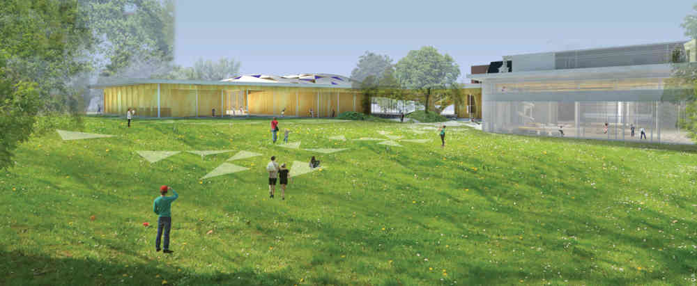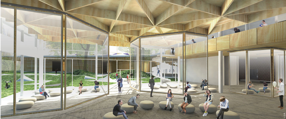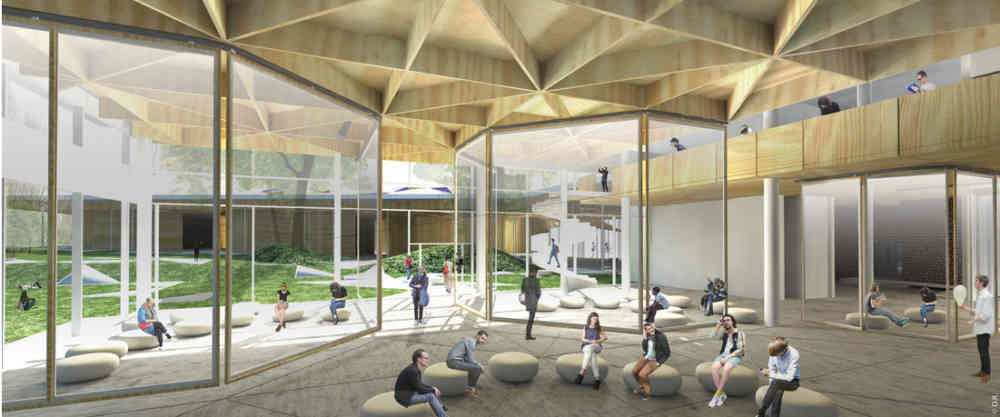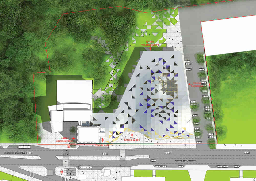 La médiathèque qui intégrait à petite échelle une partie de ces fonctions de médiation est englobée dans le projet d'ensemble qui est désormais tripartite: entrée médiathèque, entrée usagers des activités numériques, entrée des spectateurs. Le programme généré par AG Studio comprend, outre les espaces de la médiathèque rénovés, des espaces d'accueil très importants puisque le Trinum est un tiers lieu à part entière, des ateliers de création, un Fab Lab et des espaces de diffusion sous la forme d'une grande salle de 1000m2 avec un gradin rétractable de 500 places. L'ensemble du Trinum se situe à l'orée d'un vaste parc forestier qui fait transition avec les établissements scolaires et qui constitue un terrain d'aventure original.
